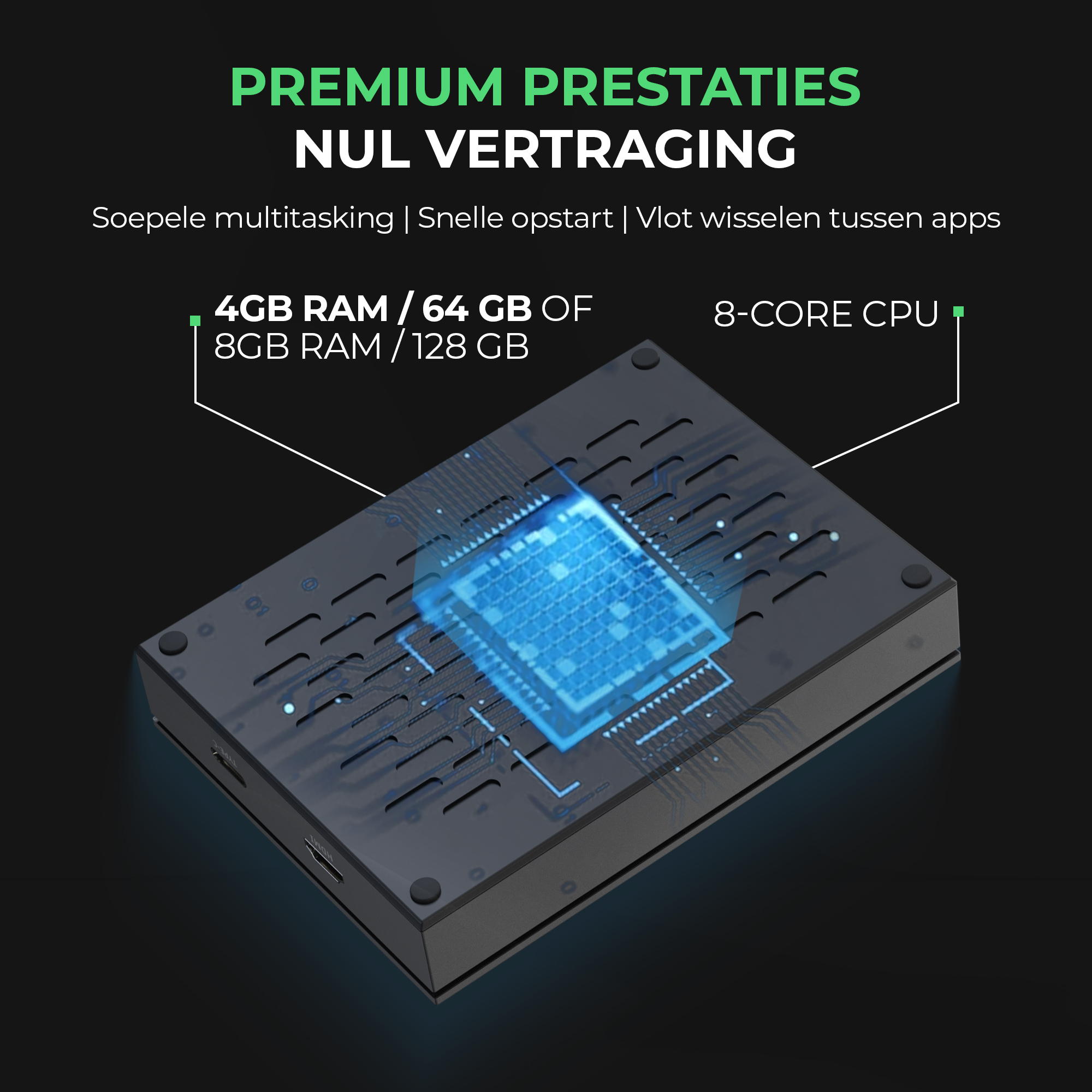Sluit hem via USB in je auto of via mini HDMI op je tv en gebruik apps zoals YouTube, Netflix, Spotify en Ziggo Go. Dankzij Android 13, een snelle Snapdragon-processor, 8GB RAM en 128GB opslag werkt alles vloeiend en zonder vertraging.